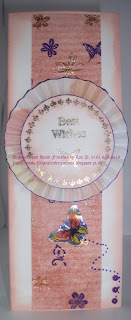 The distress ink wasnt dry!! there were bits of embossing powder all over it, but undaunted I heated it up! Which gave me a rather attractive mottled effect, and the flittered areas were embossed al well! How that happened I have no idea, but I thought it looked pretty good, so I decided to make a card with it.I cut it into 3 strips, as I thought that if the pieces were any bigger it would be too much, and then I had a bit of a brainwave, so I have all sorts of texture going on all ready, and then I went and Crimped it with my Westcott crimper. I made a DL base, added some milled lavender to the edges, and stuck the strip down the middle of the card. I made a rosette from so paper in my stash, its old and loose and I cant honestly tell you who its by, sorry, and then Flittered the sentiment. I decided to add the Violet to the edges of the rosette and sentiment, to bring it more into keeping with the rest of the card, added some pearl gems, and a butterfly and trail.